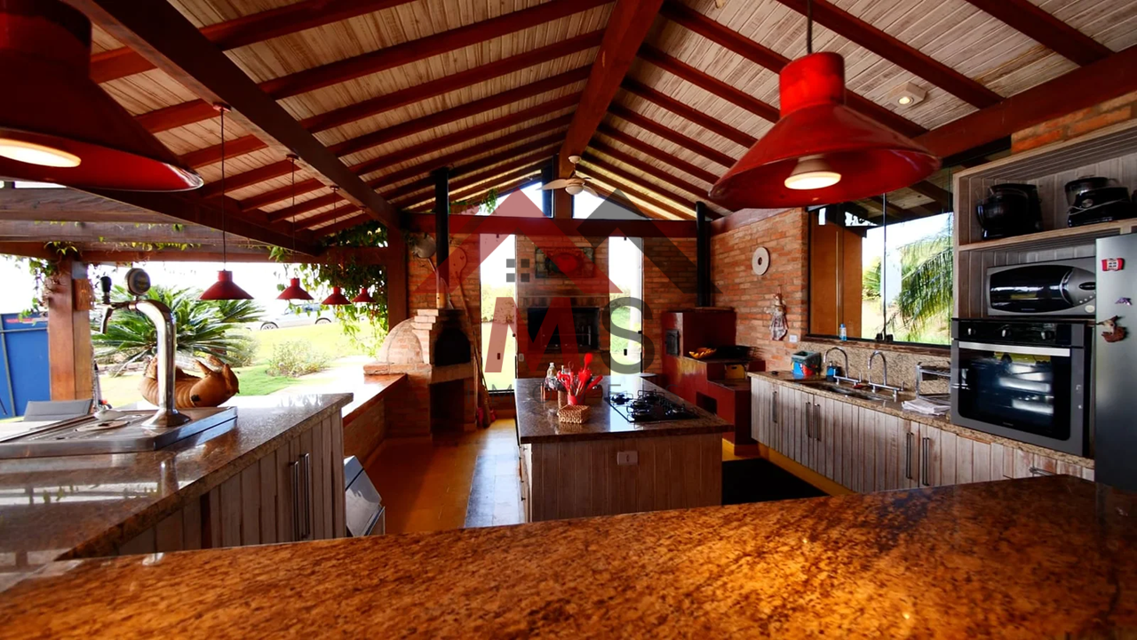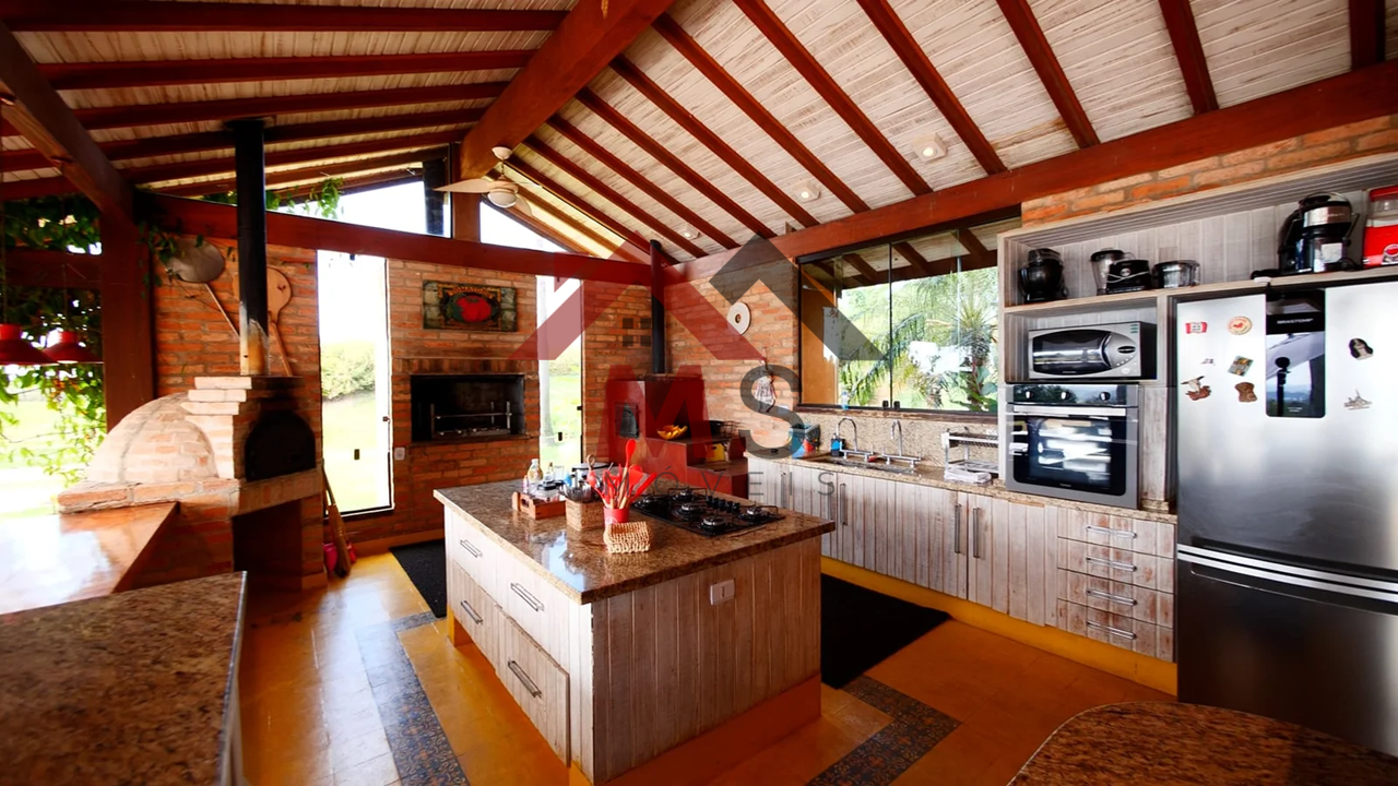 Cozinha com armários, equipada com churrasqueira, forno de pizza, fogão a lenha, geladeira, fogão, máquina de gelo, micro-ondas.